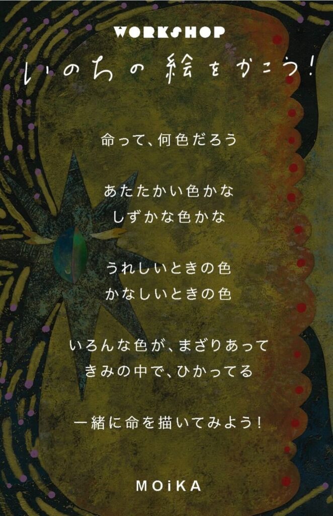 展示のタイトルは「星と命と」です。 命・太陽・月・星の4つをテーマに描きました。 命の部屋は、収穫したお米を長期間保管しておくための石蔵です。 戦争でこの場所にも爆弾が落ちましたが、不発弾で崩れなかった石蔵に「何か活かせないか」と職人が集まり町の美術館がうまれました。 今回の展示の作品と石の美術館が生まれた歴史のお話をしながら一緒に巡回します。お話が終わった後は、大きな蔵の「命」の展示の場所で、自分の命の絵を描ききます。